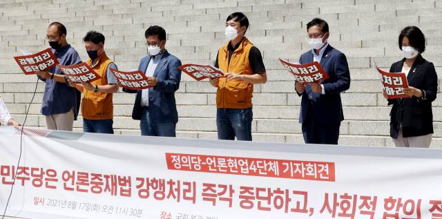 Aug 19, 2021 · 언론7단체, 언론중재법 개정안 강행 처리 항의 성명 발표. Aug 16, 2021 · 대한변호사협회(협회장 이종엽)는 16일 성명을 내고 언론중재법 개정안 처리를 즉시 보류하라고 강조했다.변협은 다수의 언론기관, 관련 시민단체 및 주요 야당의 반대에도 불구하고 '언론개혁'이라는 기치 아래 여당이 '언론중재법 개정안'을 오는 8월 25일 본회에서 처리하기로 예고한 것에 대해. 오후 2시 개의한 회의는 전문위원 검토보고, 정부. Aug 09, 2021 · 구체적으로는 지난달 27일 국회 문화체육관광위원회 소위에서 강행 처리된 언론중재법 개정안의 국회 문체위 및 본회의 회부를 중단할 것, 이번 개정안은 전 세계적으로 유례를 찾아볼 수 없는 규제 악법으로 민주당은 언론중재법 개정안의 징벌적 손해배상제 등 각종 규제의 근거가 되는 입법 사례를 밝힐 것, 민주당은 개정안의 위헌성 여부에 대해 헌법학자의 의견을 먼저. 13건은 징벌적 손해배상제, 기사열람차단청구권, 언론중재위원회 구성 변경 등과 관련된 내용이다.